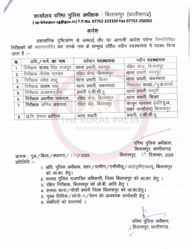 Home बिलासपुर Bilaspur police Transfer : पुलिस विभाग में तबादला, कई TI हुए इधर... बिलासपुर Bilaspur police Transfer : पुलिस विभाग में तबादला, कई TI हुए इधर से उधर By fourthline.in - December 10, 2025 235 0 FacebookTwitterPinterestWhatsApp बिलासपुर ।Bilaspur police Transfer : एसएसपी रजनेश सिंह ने आधा दर्जन से अधिक निरीक्षकों के तबादले किए हैं। इनमें कुछ को लाइन से हटाकर थानों का प्तरभारी बनाया गया है तो कुछ को थानों के प्बाभार से हटाया गया है। देखें आदेश- RELATED ARTICLESMORE FROM AUTHOR बिलासपुर CG Crime: बिलासपुर में ऑनलाइन सट्टा का भंडाफोड़, रायपुर के होटल से चला रहे थे ऑनलाइन सट्टा, दो खाईवाल गिरफ्तार बिलासपुर Bilaspur airport: अलांयस एयर के समर शेड्यूल में होगा बदलाव, बिलासपुर से दिल्ली और प्रयागराज की उड़ानें बढ़ेंगी, हैदराबाद की उड़ान भी संभव बिलासपुर Bilaspur airport : बिलासपुर में हवाई सुविधा विस्तार , हाईकोर्ट ने विमानन विभाग से शपथपत्र मांगा LEAVE A REPLY Cancel reply Please enter your comment! Please enter your name here You have entered an incorrect email address! Please enter your email address here Save my name, email, and website in this browser for the next time I comment. 0FansLike3,912FollowersFollow0SubscribersSubscribe - Advertisement - EDITOR PICKS राष्ट्रीय रामायण महोत्सव में आगंतुकों का मुस्लिम समाज शर्बत-ए-मोहब्बत से करेगा स्वागत fourthline.in - May 28, 2023 Special day with special kids: साधु राम विद्या मंदिर के सेवा क्लब का विशेष ... fourthline.in - August 31, 2024 आईपीएस मोहित गर्ग को तीसरी बार राष्ट्रपति पुलिस वीरता पदक fourthline.in - January 23, 2024 नंदकुमार साय इस तरह कब तक डालते रहते दीये में तेल ? fourthline.in - May 3, 2023