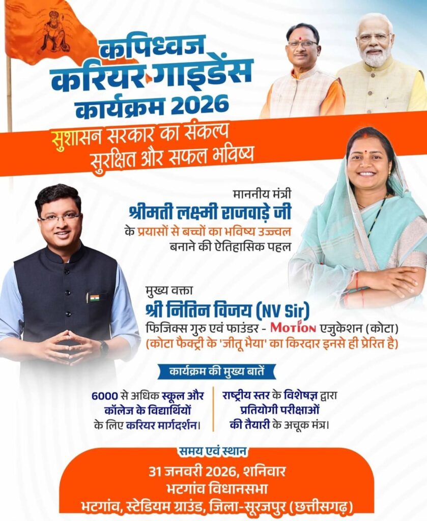 सूरजपुर। Career Guidance Programme :   महिला एवं बाल विकास मंत्री श्रीमती लक्ष्मी राजवाड़े की सक्रिय सोच और युवाओं के प्रति प्रतिबद्ध नेतृत्व का सशक्त उदाहरण 31 जनवरी को सूरजपुर में देखने को मिलेगा। उनके मार्गदर्शन में कपिध्वज–करियर गाइडेंस कार्यक्रम 2026 का आयोजन भटगांव ग्राउंड में किया जा रहा है, जिसमें जिले के 6 हजार से अधिक छात्र भाग लेकर अपने करियर को लेकर ठोस दिशा प्राप्त करेंगे।