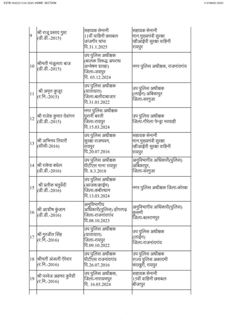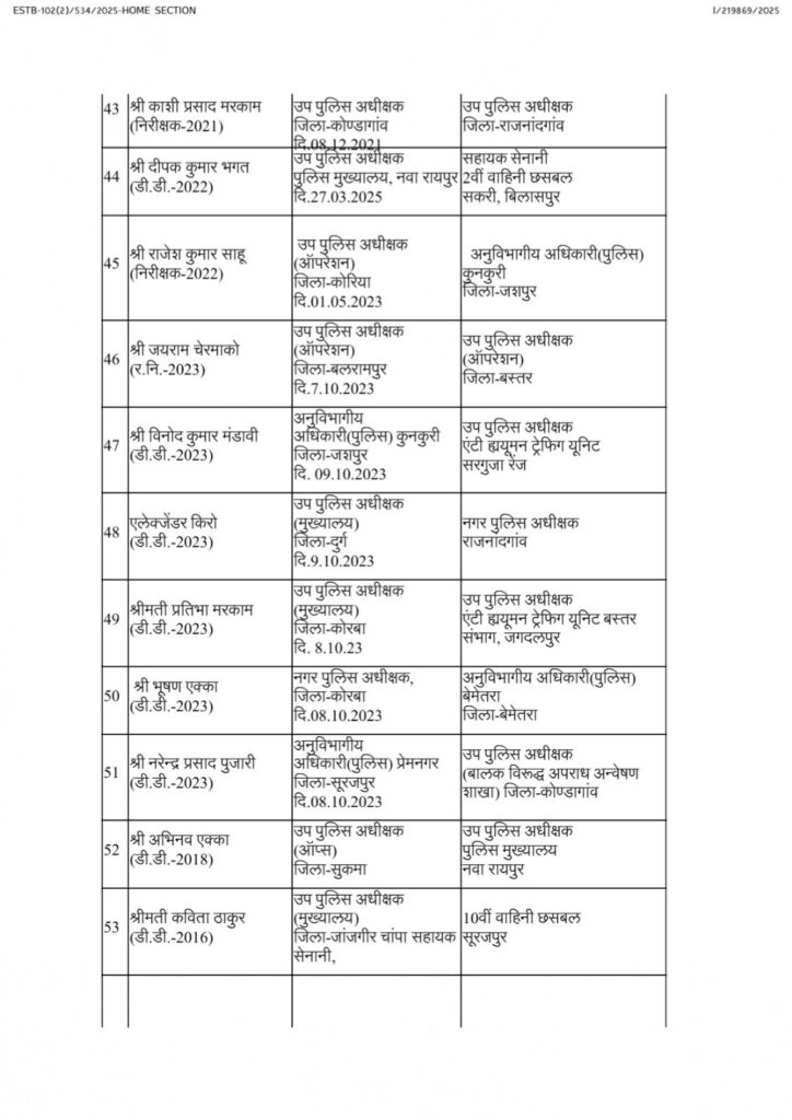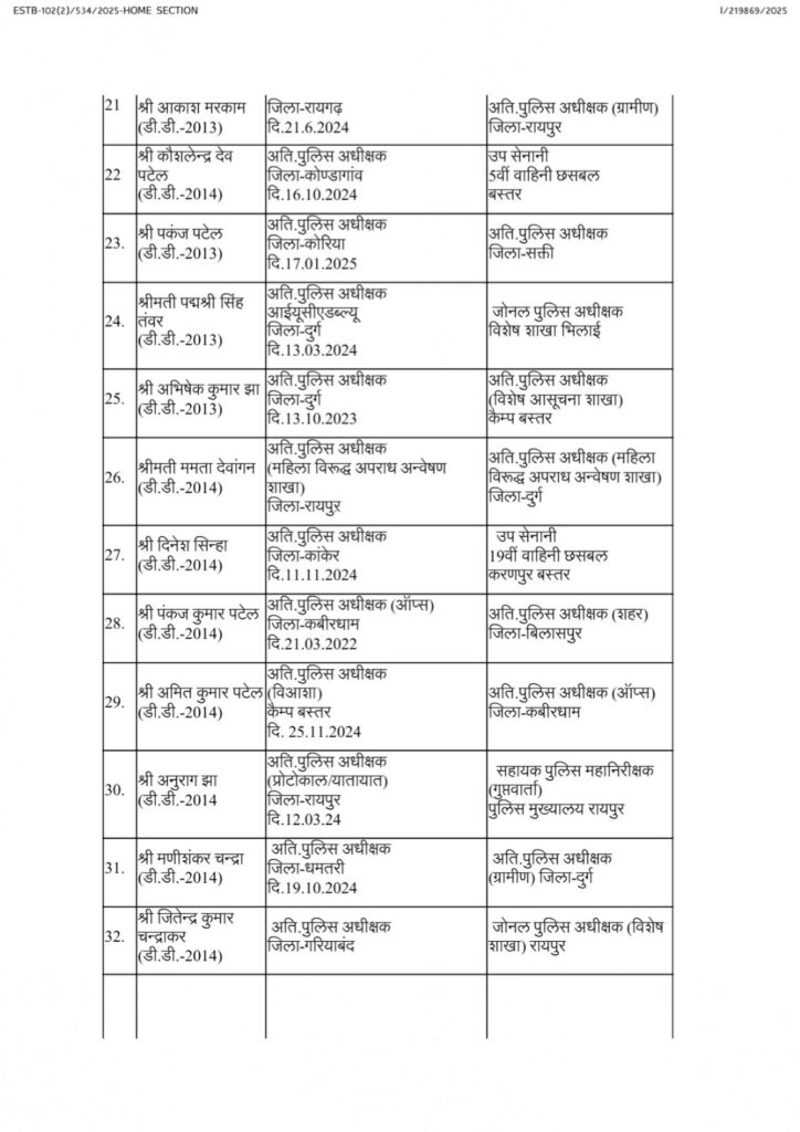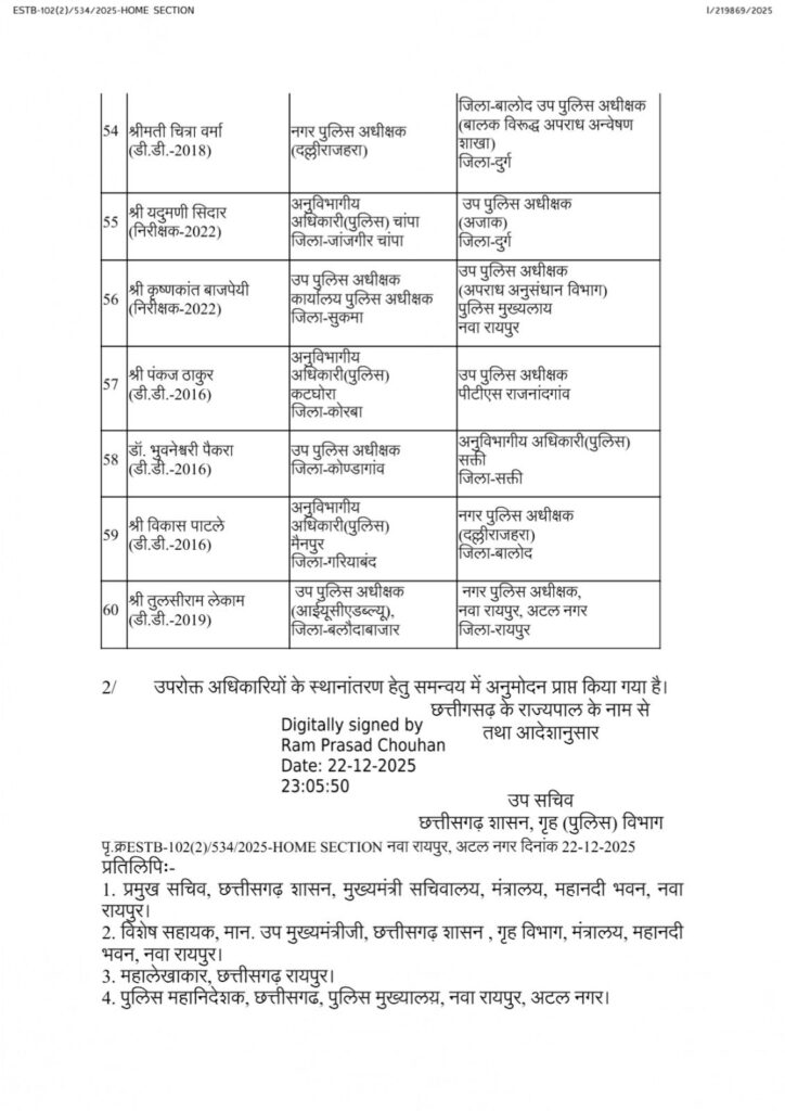 Home छत्तीसगढ़ पुलिस CG Police Trasfer: छत्तीसगढ़ में एएसपी -डीएसपी का थोक में तबादला, एक... छत्तीसगढ़ पुलिस CG Police Trasfer: छत्तीसगढ़ में एएसपी -डीएसपी का थोक में तबादला, एक साथ 60 से अधिक पुलिस अधिकारी प्रभावित By fourthline.in - December 23, 2025 185 0 FacebookTwitterPinterestWhatsApp रायपुर। CG Police Trasfer: राज्य शासन के गृह विभाग ने प्रदेश भर में पदस्थ ASP-DSP और अन्य समकक्ष अफसरों की तबादला सूची जारी की है। देखें आदेश : RELATED ARTICLESMORE FROM AUTHOR छत्तीसगढ़ पुलिस CG IPS Transfer: कांकेर एसएसपी इंदिरा कल्याण अलेसेला का तबादला, दो जिलों के एसपी के बदले छत्तीसगढ़ पुलिस Raipur City News : न्यू ईयर से पहले पुलिस एक्शन में, JD फॉर्म हाउस में छापा, नशे में धुत 21 युवक-युवतियां पकड़े गए छत्तीसगढ़ पुलिस New Cyber Fraudsters : इन साइबर ठगों से सावधान ! BLO बनकर OTP मांग रहे ठग, पुलिस ने किया अलर्ट LEAVE A REPLY Cancel reply Please enter your comment! Please enter your name here You have entered an incorrect email address! Please enter your email address here Save my name, email, and website in this browser for the next time I comment. 0FansLike3,912FollowersFollow0SubscribersSubscribe - Advertisement - EDITOR PICKS सुनसान इलाके में बच्चे की खून से सनी हुई लाश मिली, चचेरी बहन सहित... fourthline.in - May 25, 2023 Chhattisgarh Weather alert: खाड़ी में बना कम दबाव का क्षेत्र, छत्तीसगढ़ में भारी बारिश की... fourthline.in - August 18, 2025 डा. रमन सिंह होंगे मुख्यमंत्री, नाम की घोषणा एक-दो दिन में fourthline.in - December 5, 2023 छत्तीसगढ़ में सड़कों के काम में लीपापोती: गुणवत्ताहीन निर्माण पाए जाने पर ठेका कंपनी... fourthline.in - February 28, 2024