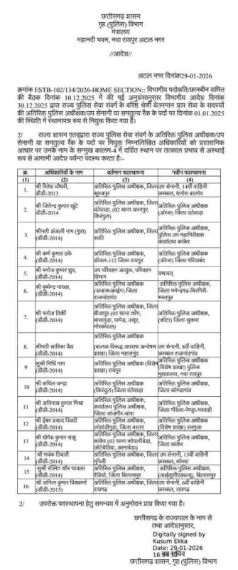 CG Police Transfer : यह नियुक्ति विभागीय पदोन्नति-छानबीन समिति की बैठक में की गई सिफारिशों के आधार पर की गई है। नियुक्ति का उद्देश्य राज्य में पुलिस प्रशासन को मजबूत बनाना और वरिष्ठ अधिकारियों को अधिक जिम्मेदारी सौंपकर बेहतर कानून व्यवस्था सुनिश्चित करना बताया गया है। पदोन्नति और नई नियुक्तियों के साथ ही संबंधित अधिकारियों को उनके नए जिलों और कार्यस्थलों में पदभार संभालने के लिए निर्देश दिए गए हैं।