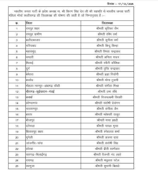 Home छत्तीसगढ़ CG political: महिला मोर्चा के प्रदेश पदाधिकारी और जिला अध्यक्षों की नियुक्ति,... छत्तीसगढ़राजनीति CG political: महिला मोर्चा के प्रदेश पदाधिकारी और जिला अध्यक्षों की नियुक्ति, देखें किसे मिली कहां की जिम्मेदारी By fourthline.in - December 18, 2025 118 0 FacebookTwitterPinterestWhatsApp रायपुर। CG political: भाजपा अध्यक्ष किरण देव सिंह ने महिला मोर्चा के प्रदेश पदाधिकारियों और जिला अध्यक्षों की नियुक्ति कर दी है। रायपुर शहर अध्यक्ष कृतिका जैन और ग्रामीण अध्यक्ष रश्मि वर्मा को बनाया गया है।सूची देखें :- RELATED ARTICLESMORE FROM AUTHOR छत्तीसगढ़ CG News : छत्तीसगढ़ के स्कूलों में डिजिटल हाजिरी लागू, शिक्षकों-छात्रों की उपस्थिति अब ऑनलाइन होगी दर्ज छत्तीसगढ़ CG liquor scam: शराब घोटाले में सौम्या चौरसिया को मिले थे 115 करोड़ , ED ने प्रेस नोट में दी जानकारी छत्तीसगढ़ CG SIR 2025: छत्तीसगढ़ में 27.5 लाख से ज्यादा वोटर लिस्ट से बाहर, सबसे ज्यादा रायपुर में, 23 दिसंबर को जारी होगी सूची LEAVE A REPLY Cancel reply Please enter your comment! Please enter your name here You have entered an incorrect email address! Please enter your email address here Save my name, email, and website in this browser for the next time I comment. 0FansLike3,912FollowersFollow0SubscribersSubscribe - Advertisement - EDITOR PICKS Former speaker Rajendra Prasad Shukla: पूर्व विधानसभा अध्यक्ष राजेंद्र प्रसाद शुक्ल की मौत के... fourthline.in - April 20, 2025 CG liquor scam: पूर्व आबकारी मंत्री लखमा को राहत नहीं, हाईकोर्ट ने ACB-EOW से... fourthline.in - February 27, 2025 कार-ट्रक की आमने-सामने की टक्कर में दूल्हा-दुल्हन समेत 5 की मौत fourthline.in - December 10, 2023 प्रधानमंत्री की ‘परीक्षा पे चर्चा’ सभी परीक्षार्थियों के लिए अनुकरणीय- साव fourthline.in - January 27, 2023