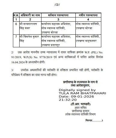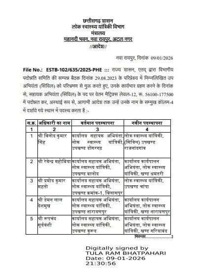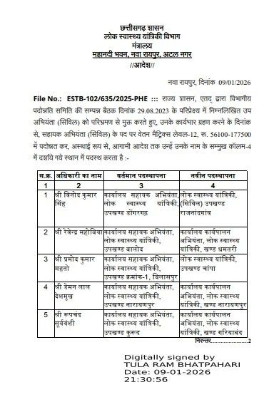 रायपुर। CG Promotion :  छत्तीसगढ़ के लोक स्वास्थ्य यांत्रिकी (PHE) विभाग से कर्मचारियों के लिए बड़ी राहत और खुशखबरी सामने आई है। शासन स्तर पर हुई विभागीय पदोन्नति समिति (DPC) की बैठक के बाद बड़ी संख्या में उप अभियंताओं (सिविल) को सहायक अभियंता (सिविल) के पद पर पदोन्नत कर दिया गया है। इस फैसले से विभाग में लंबे समय से प्रमोशन का इंतजार कर रहे अधिकारियों में उत्साह का माहौल है।