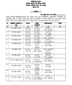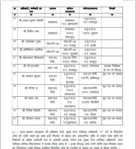 Home छत्तीसगढ़ CG Transfer : नगरीय प्रशासन विभाग में थोक में तबादले, 20 निकायों... छत्तीसगढ़ CG Transfer : नगरीय प्रशासन विभाग में थोक में तबादले, 20 निकायों के सीएमओ बदले By fourthline.in - April 18, 2026 163 0 FacebookTwitterPinterestWhatsApp रायपुर। CG Transfer : नगरीय प्रशासन एवं विकास विभाग में बड़ा फेरबदल किया गया है। जारी आदेश में कुल 37 अधिकारियों और कर्मचारियों के तबादले किए गए हैं, जिनमें 20 मुख्य नगर पालिका अधिकारी (CMO) भी शामिल हैं। देखें सूची – RELATED ARTICLESMORE FROM AUTHOR कला-संस्कृति Bangla New Year : बंगाली नववर्ष मिलन समारोह में शामिल हुए मुख्यमंत्री विष्णुदेव साय छत्तीसगढ़ CG Weather : छत्तीसगढ़ में हीटवेव का अलर्ट, रायपुर, बिलासपुर में 43°C के पार पहुंचा पारा छत्तीसगढ़ School summer vacation: छत्तीसगढ़ में 20 अप्रैल से स्कूलों में गर्मी की छुट्टी, सीएम साय ने बच्चों को लू से बचाने लिया फैसला LEAVE A REPLY Cancel reply Please enter your comment! Please enter your name here You have entered an incorrect email address! Please enter your email address here Save my name, email, and website in this browser for the next time I comment. 0FansLike3,912FollowersFollow0SubscribersSubscribe - Advertisement - EDITOR PICKS मुख्यमंत्री का शपथ समारोह अब 4 बजे से, अतिथियों के आने में देरी, बढ़ाया... fourthline.in - December 13, 2023 अब जूनियर डाक्टरों, नर्सों की हड़ताल, मरीजों की बढ़ सकती है परेशानी fourthline.in - July 30, 2023 Snack Bite: नाग के डसने पर उसे मार दिया, बदला लेने नागिन ने घर... fourthline.in - August 1, 2023 Strange and wonderful: जो कार कभी छत्तीसगढ़ नहीं आई बिलासपुर में उसका भी कट... fourthline.in - June 15, 2025