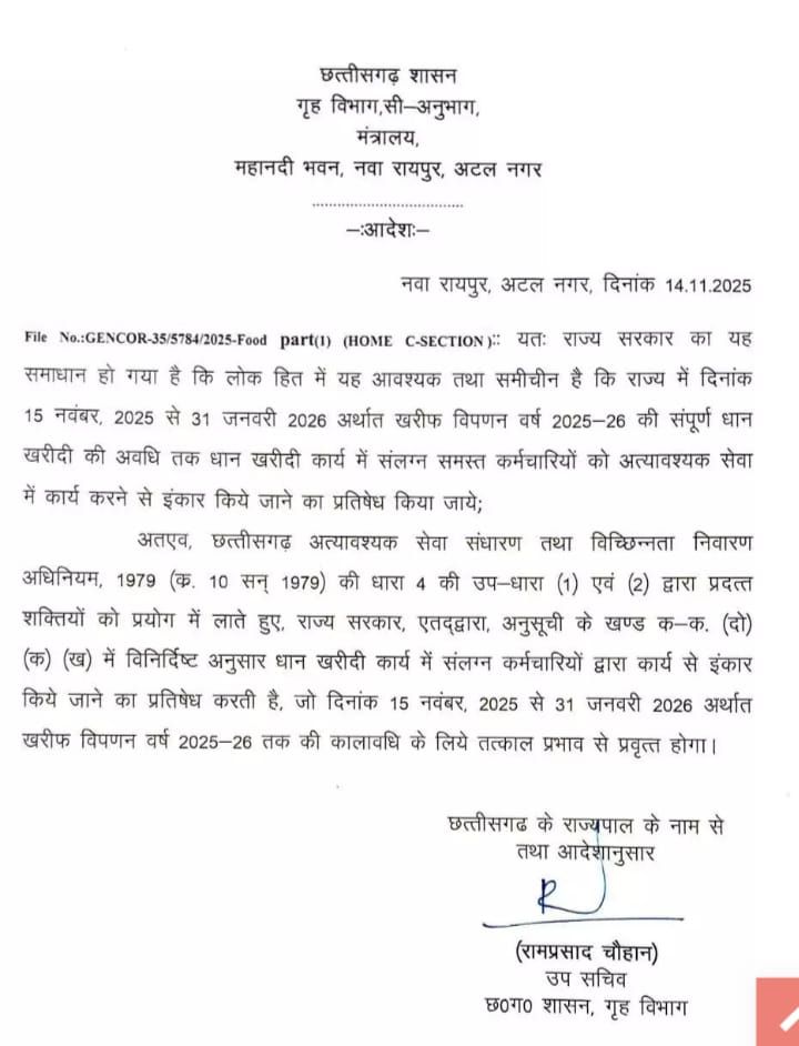 रायपुर। ESMA on cooperative workers: छत्तीसगढ़ में आज से किसानों से समर्थन मूल्य पर धान खरीदी शुरू हो रही है। वहीं सहकारी समितियों के कर्मचारी चार सूत्रीय मांगों को लेकर हड़ताल पर हैं, जिससे व्यवस्था प्रभावित होने की आशंका है। इसी के मद्देनजर सरकार ने प्रदेश में एस्मा लागू कर दिया है। इस संबंध में गृह विभाग ने एक आदेश जारी किया है।