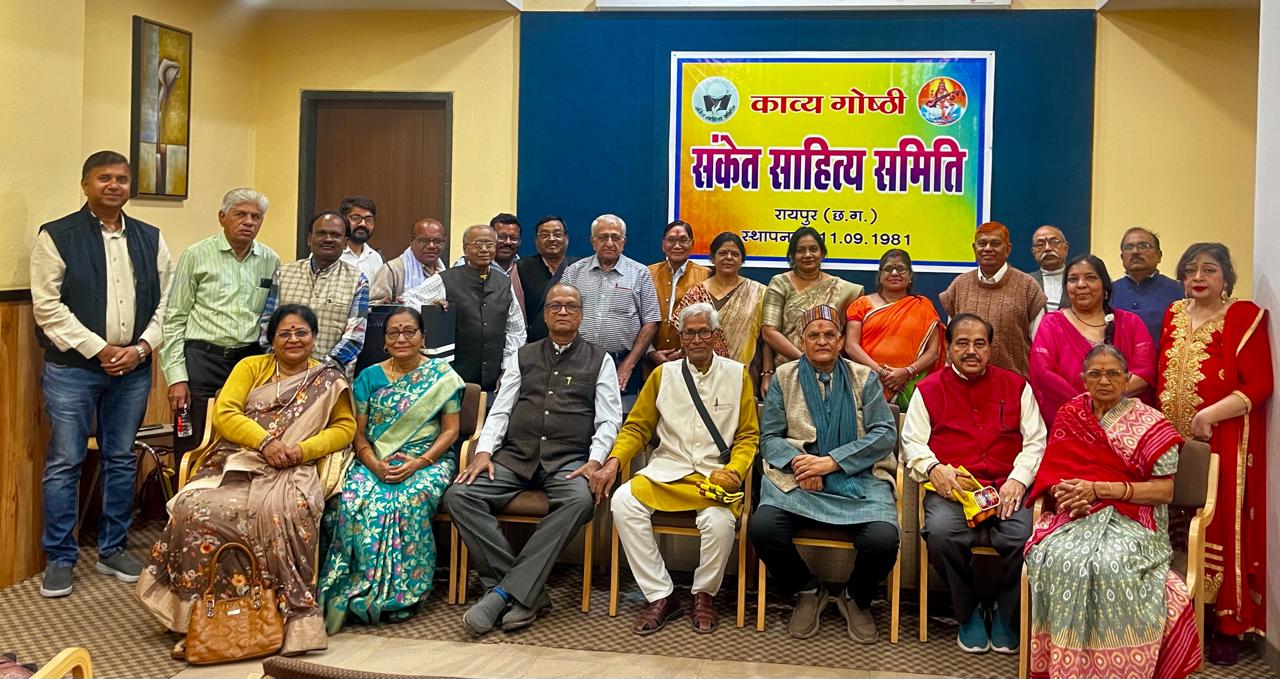 रायपुर।  Poetry symposium:  संकेत साहित्य समिति ने छत्तीसगढ़ राज्य के रजत जयंती वर्ष के उपलक्ष्य में 17 नवम्बर को राजधानी रायपुर में स्थानीय कवियों की काव्य -गोष्ठी का आयोजन किया । सिविल लाइन स्थित वृन्दावन सभागृह में यह आयोजन हुआ । काव्य -गोष्ठी में  वरिष्ठ साहित्यकार और भाषा विज्ञानी,  डॉ. चित्तरंजन कर मुख्य अतिथि के रूप में उपस्थित थे। अध्यक्षता सुप्रसिद्ध कवि और व्यंग्यकार गिरीश पंकज ने की । साहित्यकार डॉ. मृणालिका ओझा, संजीव ठाकुर, शरदेन्दु झा और गणेश दत्त झा ने आयोजन में विशेष अतिथि के रूप हिस्सा लिया।