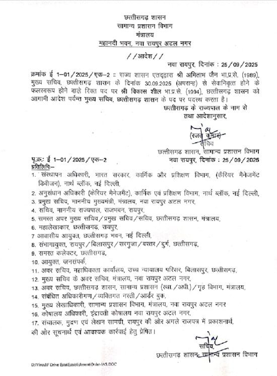 Vikassheel new CS: जनवरी 2024 में भारत के सबसे महत्वाकांक्षी ग्रामीण जल आपूर्ति कार्यक्रमों में से एक का संचालन किया। मार्च 2025 में केंद्र सरकार ने उन्हें सचिव/सचिव-समकक्ष ग्रेड के लिए एंपैनल किया। इस एंपैनलमेंट को छत्तीसगढ़ कैडर में उनकी सीनियरिटी और अनुभव के लिहाज से एक बड़ी उपलब्धि मानी जा रही है।