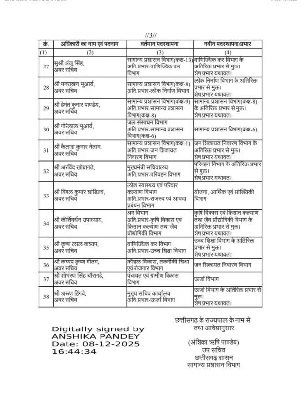 Home छत्तीसगढ़ CG SASTransfer : छत्तीसगढ़ राज्य प्रशासनिक सेवा के 38 अधिकारियों के तबादले छत्तीसगढ़ CG SASTransfer : छत्तीसगढ़ राज्य प्रशासनिक सेवा के 38 अधिकारियों के तबादले By fourthline.in - December 8, 2025 602 0 FacebookTwitterPinterestWhatsApp रायपुर।CG SASTransfer : राज्य सरकार ने राज्य प्रशासनिक सेवा (SAS) के अधिकारियों के बड़े पैमाने पर तबादले किए हैं। सामान्य प्रशासन विभाग ने सोमवार को नए ट्रांसफर आदेश जारी किए, जिनमें कुल 38 अधिकारियों के नाम शामिल हैं। देखें आदेश– RELATED ARTICLESMORE FROM AUTHOR छत्तीसगढ़ Paddy procurement: किसानों के लिए सीएम साय की बड़ी घोषणा, धान खरीदी की समय सीमा बढ़ी छत्तीसगढ़ CG liquor scam : पूर्व आबकारी मंत्री कवासी लखमा को सुप्रीम कोर्ट से जमानत मंजूर छत्तीसगढ़ Pensioners Federation: पेंशनरों के मुद्दों पर बजट की खामोशी निराशाजनक, पेंशन नहीं तो महंगाई राहत को ही करें आयकर से मुक्त LEAVE A REPLY Cancel reply Please enter your comment! Please enter your name here You have entered an incorrect email address! Please enter your email address here Save my name, email, and website in this browser for the next time I comment. 0FansLike3,912FollowersFollow0SubscribersSubscribe - Advertisement - EDITOR PICKS Strange action of exile: अजीबोगरीब कार्वरवाई, जो दुनिया में ही नहीं उसे कर दिया जिलाबदर fourthline.in - September 19, 2025 खाद्य विभाग के अधिकारियों ने पकड़ा 57 लाख रुपए का अवैध धान fourthline.in - January 13, 2024 CG News : बिलासपुर रेल हादसे पर रेलवे बोर्ड की बड़ी कार्रवाई, डीआरएम सहित... fourthline.in - December 12, 2025 ईडी फिर छत्तीसगढ़ धमकी, आईएएस पी अन्बलगन समेत कई कारोबारियों वह राजनेताओं के ठिकानों... fourthline.in - January 13, 2023