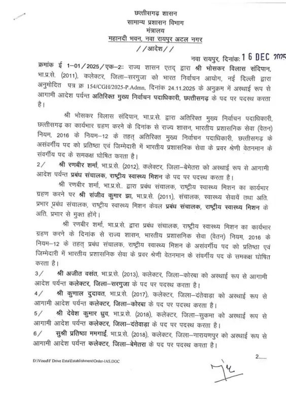 जारी आदेश के मुताबिक कोरबा कलेक्टर अजीत वसंत को सरगुजा जिले की कमान सौंपी गई है। वहीं दंतेवाड़ा कलेक्टर के रूप में कार्यरत कुणाल दुदावत को अब कोरबा जिले का नया कलेक्टर बनाया गया है। सुकमा कलेक्टर देवेश ध्रुव को दंतेवाड़ा जिले की जिम्मेदारी दी गई है। इसके अलावा नारायणपुर की कलेक्टर रही प्रतिष्ठा ममगाई को बेमेतरा का कलेक्टर नियुक्त किया गया है, जबकि नम्रता जैन को नारायणपुर जिले की कमान सौंपी गई है।