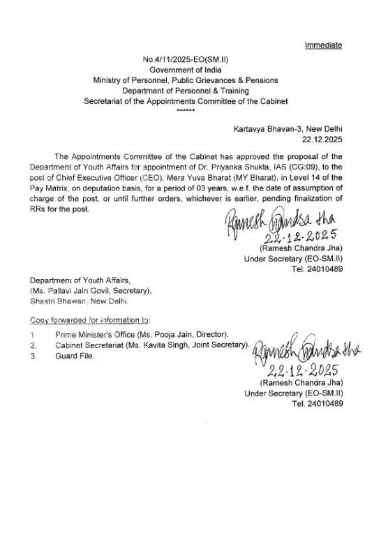 IAs Dr. Priyanka Shukla : कार्मिक एवं प्रशिक्षण विभाग (DoPT) द्वारा जारी आदेश के मुताबिक, डॉ. प्रियंका शुक्ला की यह नियुक्ति प्रतिनियुक्ति आधार पर तीन वर्षों के लिए की गई है। उन्हें पे मैट्रिक्स लेवल-14 के अंतर्गत यह जिम्मेदारी सौंपी गई है। नियुक्ति पदभार ग्रहण करने की तिथि से प्रभावी होगी या अगले आदेश तक लागू रहेगी। साथ ही यह व्यवस्था तब तक प्रभावी रहेगी, जब तक MY Bharat के CEO पद के लिए भर्ती नियमों को अंतिम रूप नहीं दिया जाता।